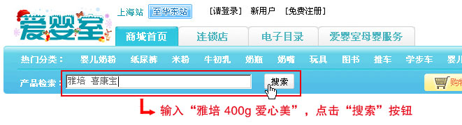 搜索规则 1.搜索入门 > 爱婴室网站搜索简单方便。您只需要在搜索框内输入需要查询的内容,敲回车键,或者鼠标点击搜索框右侧的“搜索”按钮,就可以找到您要的产品 2.使用多个词语搜索 > 输入多个词语搜索(不同字词之间用一个空格隔开),可以获得更精确的搜索结果。 例如:您想购买“雅培400g爱心美”产品,您可以在搜索框中输入“雅培 400g 爱心美”获得的搜索效果会比输入“爱心美”得到的结果更好。